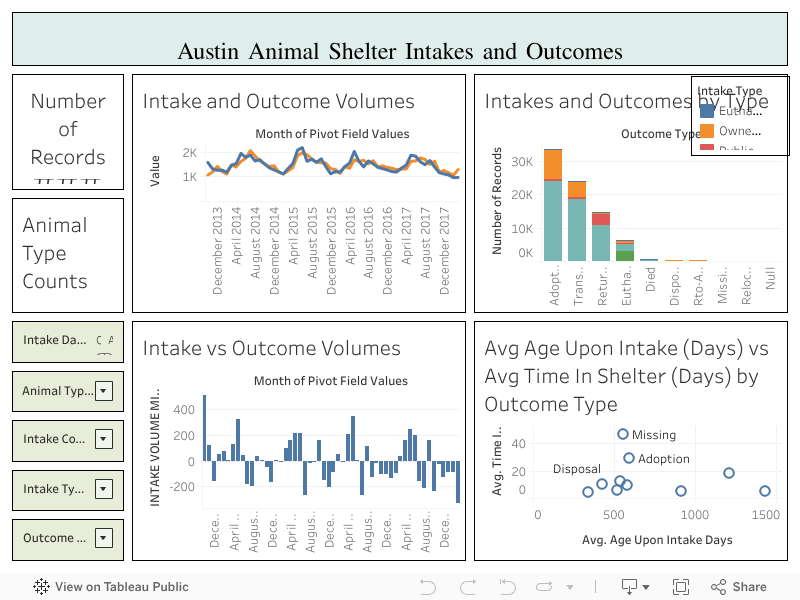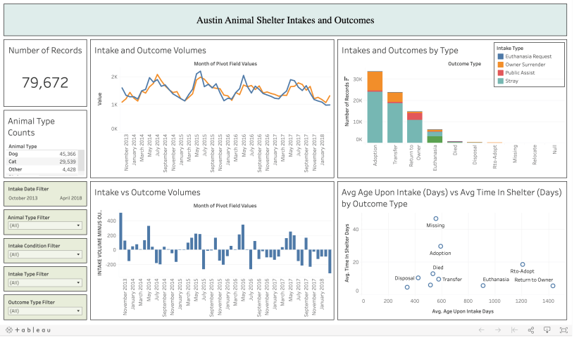Tableau project for graduate course in Data Visualization focusing on Austin animal shelter dataset. Click here to view the dashboard on Tableau Public.